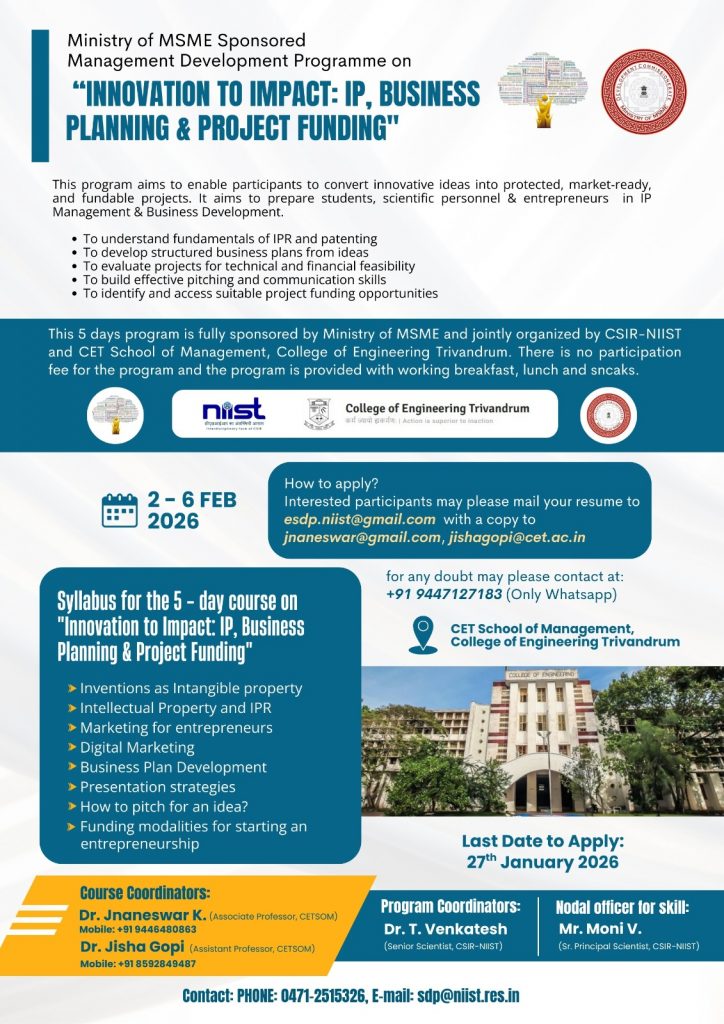 “MDP by NIIST-CET Programme Innovation to impact: IP, Business Planning and Project Funding”